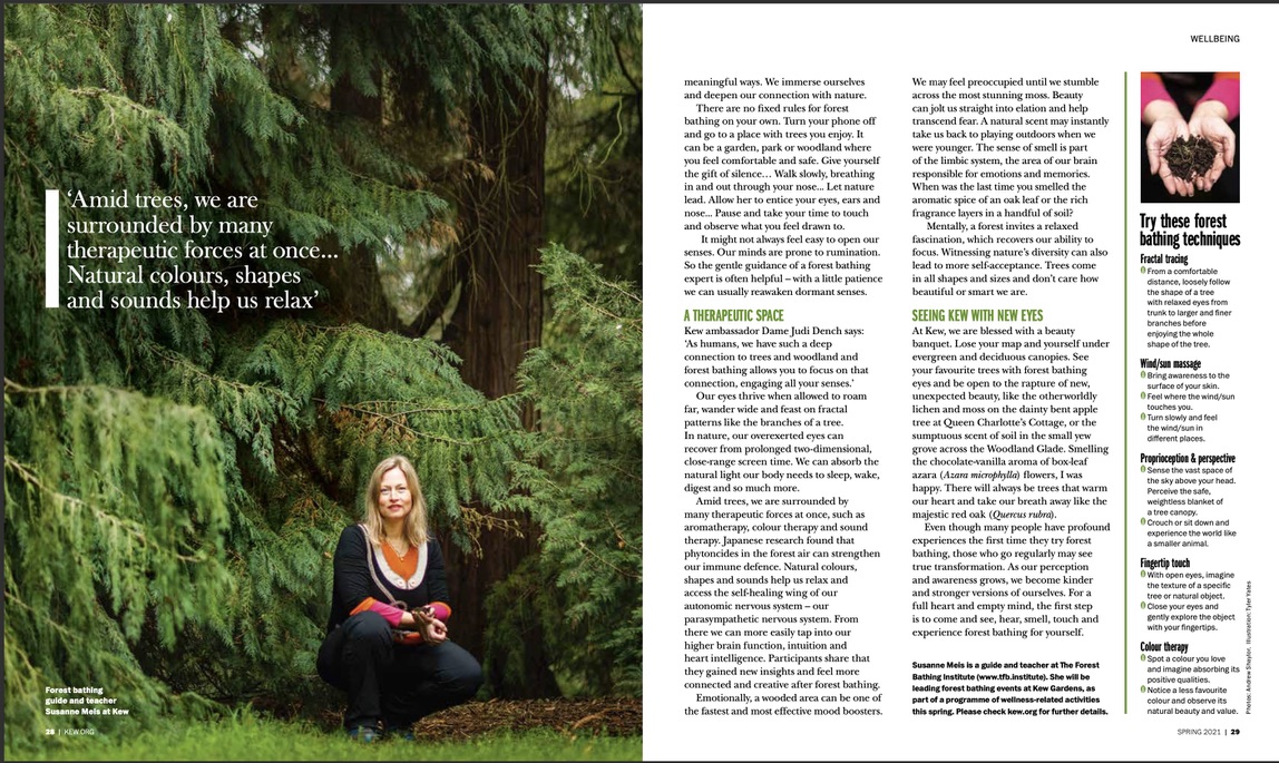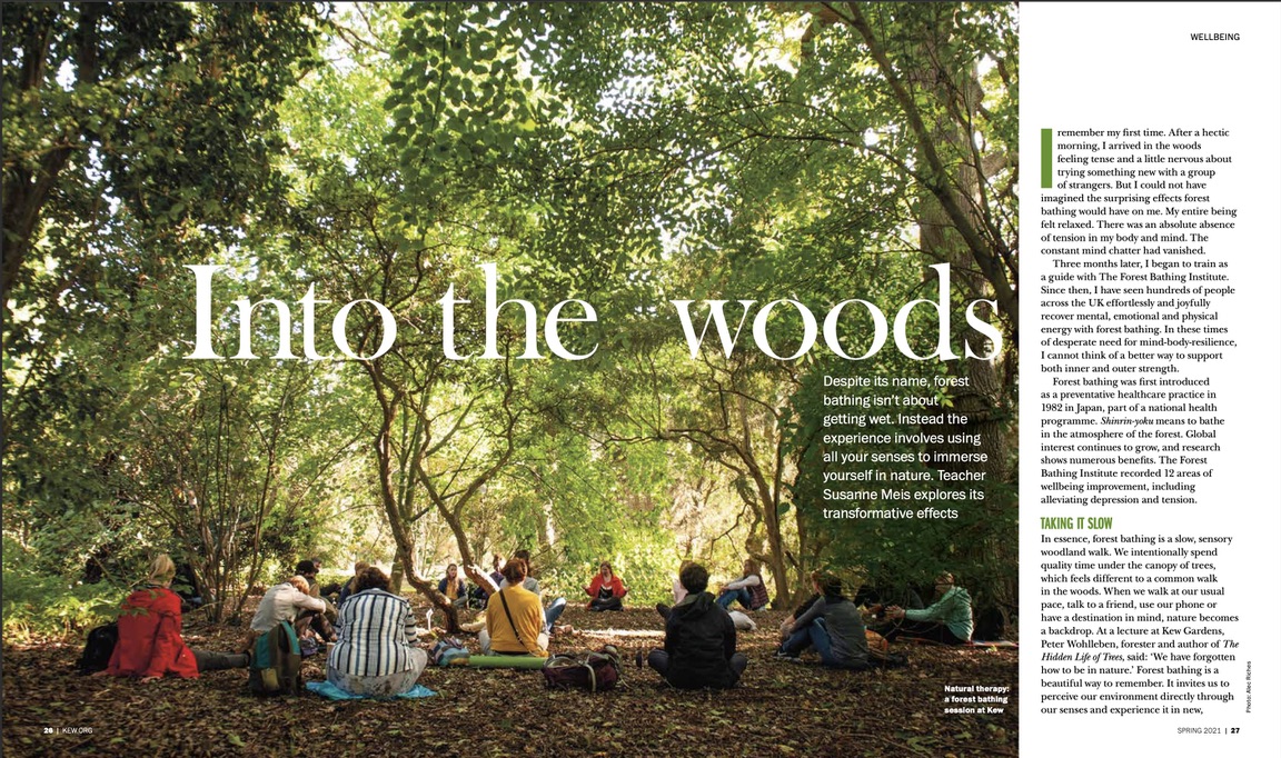 I was invited to write the headline feature on Forest Bathing to help highlight the many wellbeing benefits of Forest Bathing and introduce this remarkable, restorative practice to Kew Gardens and its global client base.